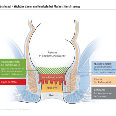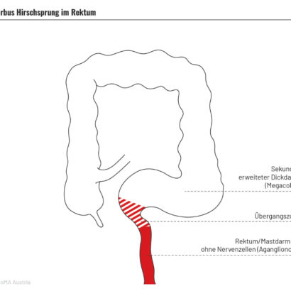Wenn bei Ihrem Kind oder Ihnen die Diagnose Morbus Hirschsprung (MH) oder totale Colon-Aganglionose gestellt wurde, dann fehlen ab dem Darmausgang aufwärts Nervenzellen, die für die Peristaltik, also den Weitertransport des Stuhls im Darm verantwortlich sind.