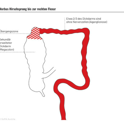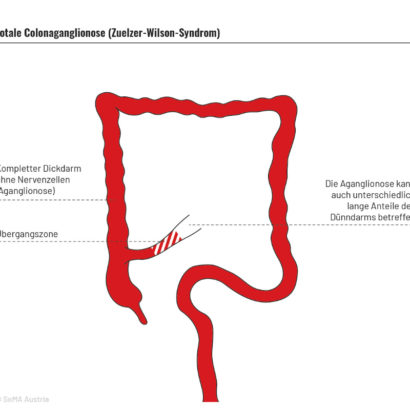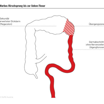 MH ist eine Fehlbildung und keine »Erkrankung«, die sich erst später entwickelt, wie der Name vielleicht vermuten lässt. Die Diagnostik erfordert erfahrene Fachleute. Es gibt unterschiedliche Formen, die nach der Länge des betroffenen Teils des Dickdarms unterschieden werden. Bei der totalen Colonaganglionose (Zuelzer-Wilson-Syndrom) ist der gesamte Dickdarm betroffen, manchmal auch ein Teil des Dünndarms. Eine Übersicht geben die Abbildungen. Fachbegriffe finden Sie im Glossar. Im SoMA Podcast erzählen erwachsene Betroffene aus ihrem Alltag.